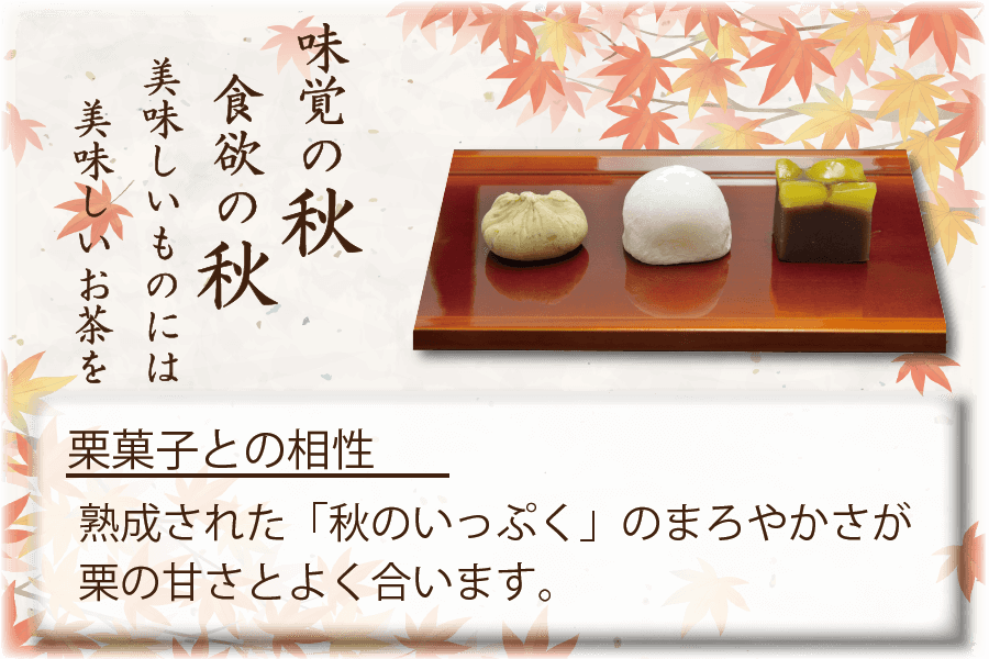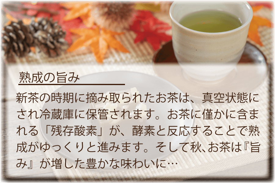 お茶の熟成?? 5月に収穫されたお茶は荒茶に加工され冷蔵庫に保管されます。暑い夏の間、涼しい冷蔵庫で保管されている間にお茶は自然と熟成されうま味を増しています。そしてこの時期、6ヶ月の眠りから覚めたお茶はまろやかさを引き出すため低温で火入れ焙煎し「熟成銘茶秋のいっぷく」として皆さまのもとへお届けいたします。秋はお茶を楽しむのにぴったりの季節!実りの秋でもあり、おいしいお菓子もたくさんあります。こころ和むくつろぎの時間に、お客さまのおもてなしに・・・ぜひお好きなお菓子と「秋のいっぷく」を一緒にお楽しみください。